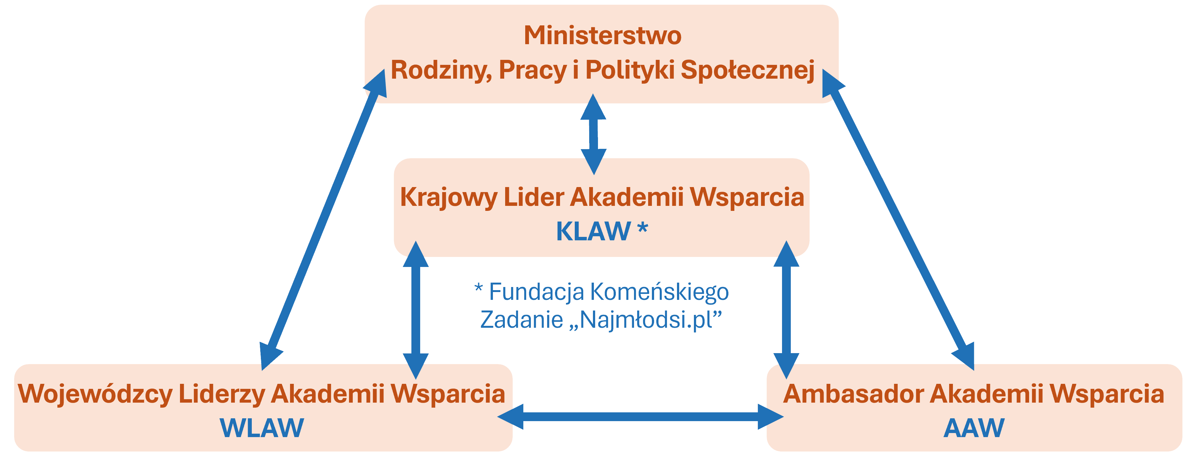 W ramach zadania „Najmłodsi.pl” Fundacja Komeńskiego współpracuje z MRPiPS oraz Wojewódzkimi Liderami Akademii Wsparcia i Ambasadorem AW między innymi przygotowując i prowadząc szkolenia dla WLAW, wydając i upowszechniając publikacje (np. Poradnik do standardów).